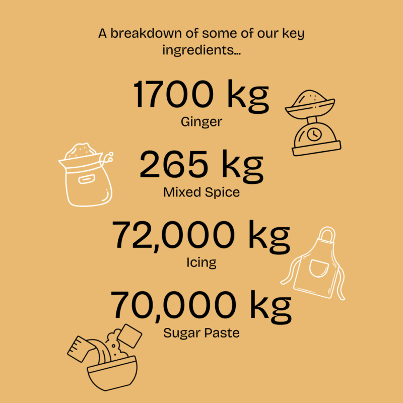 Behind every beautifully decorated biscuit lies an equally impressive mountain of ingredients. Our most‑used staples included icing sugar, flour and shortening — but the heart of our gingerbread heritage stayed strong too, with more than 1700 kg of ginger, 265 kg of mixed spice, 271 kg of cardamom, over 72,000 kg of icing, 70,000 kg of sugar paste, and 33 kg of Billington’s secret spice blend, bringing warmth to every batch.
