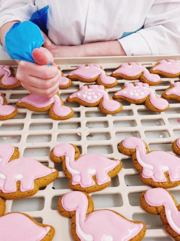 - Sugar pasting – feeding through the sugar paste machine. The sugar paste is then applied to the biscuit.