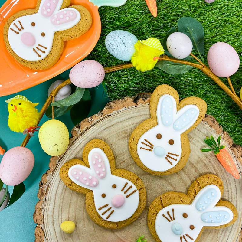 Each biscuit is baked using our delicious signature gingerbread mix, offering a warm, gently spiced flavour with a crisp, satisfying snap that softens as you enjoy it. The fresh ginger aroma builds with every bite, while the smooth icing melts away to reveal that classic comforting spice beneath. Every bunny is shaped into a cute rabbit face and finished with a sugarpaste background, neatly piped whiskers and cheerful pastel ear details – all lovingly crafted by our talented decorating team.